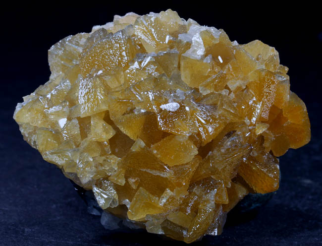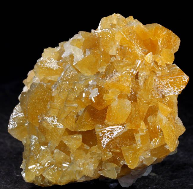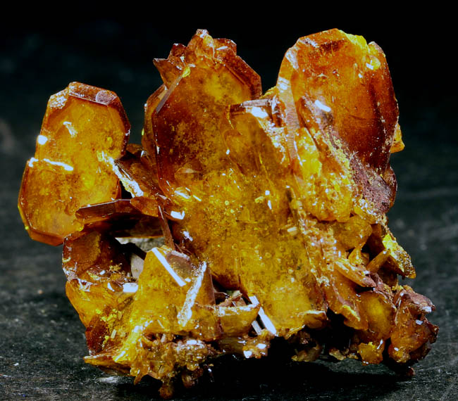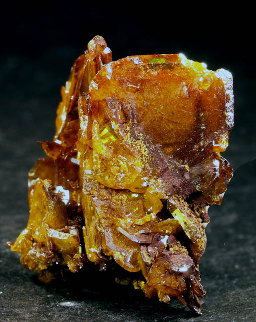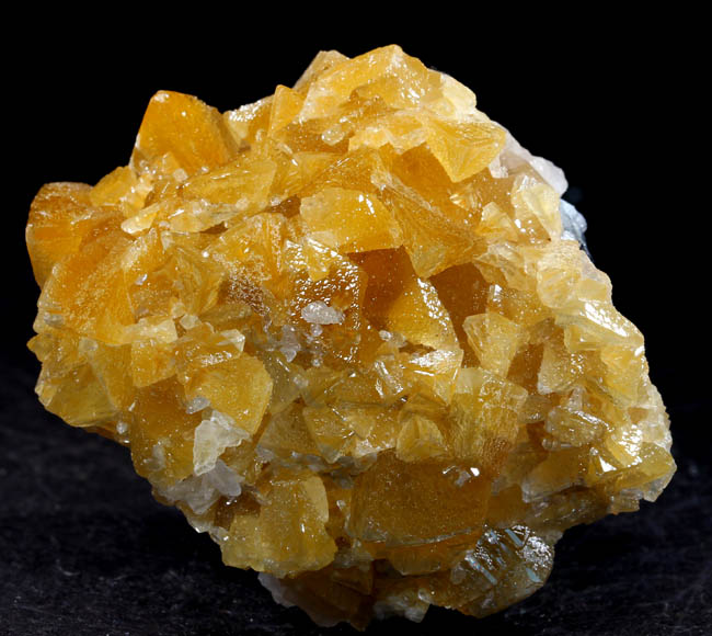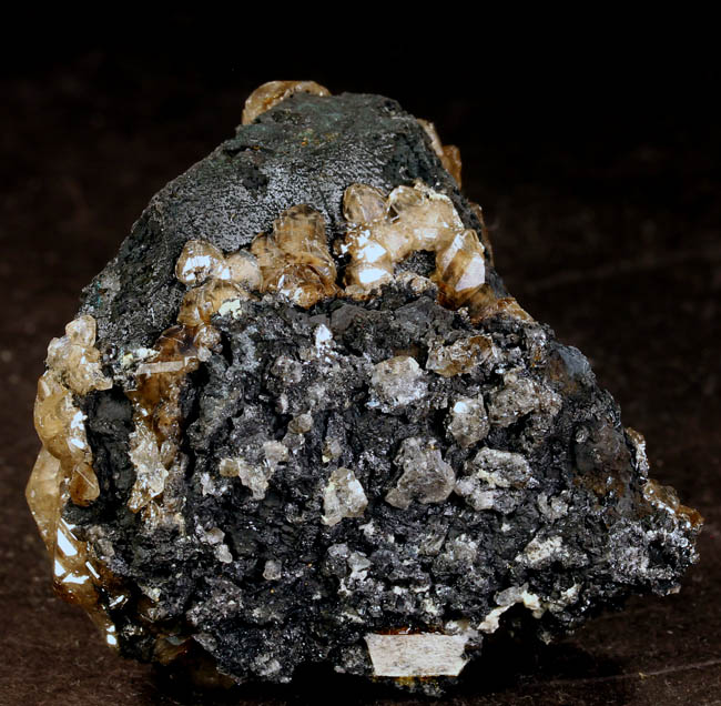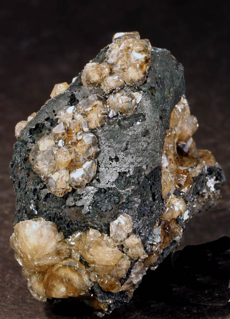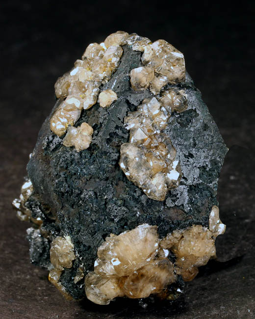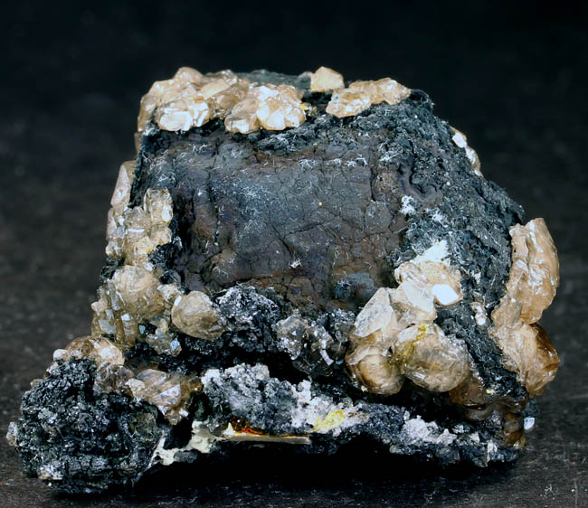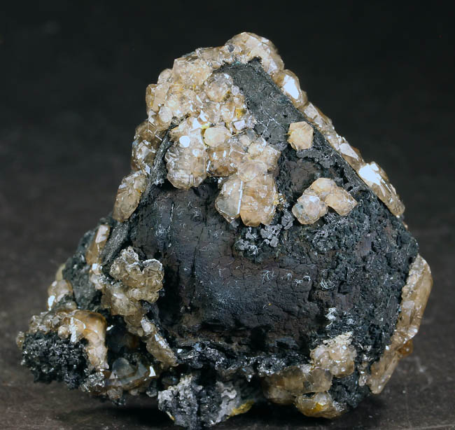 BR615. Smithsonite (cadmium), cerussite on galena. Tsumeb mine, Tsumeb, Namibia. 5.5 x 4.5 cm 91g $275.00 Honey color rhombs up to 1 cm on galena, with tiny cerussite here and there. Ex: Claude H. Yoder coll.#454 Purchased: 3-1998. Ex: Mineralogical Research. An impressive example of the rare, cadmium-rich variety of Smithsonite, from the most important locality for these crystals. Throughout the late 1970s, these came out of Tsumeb in a very few small pockets. Such pieces were always rare, and highly valued even locally. Crystals of this sharpness, and in such nice clusters, are uncommon today. The Smithsonite rhombs are a very nice, light orangish yellow in color, and they have a sparkly, silky luster and classic, curved rhombohedra habit. The largest Smithsonite crystal is about 1 cm on edge. This piece is complete & crystals creates an aesthetic, 3-dimensional look. Classic and aesthetic. RESERVED |