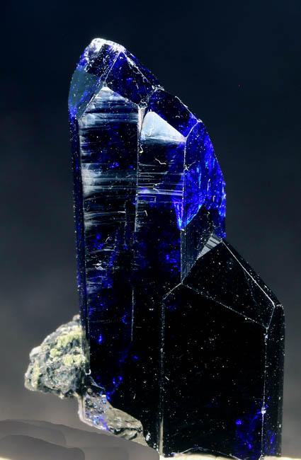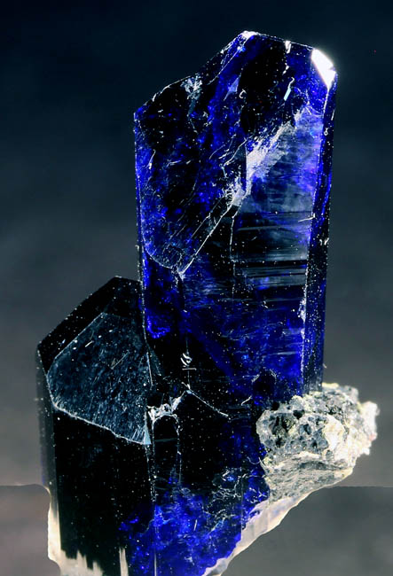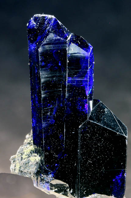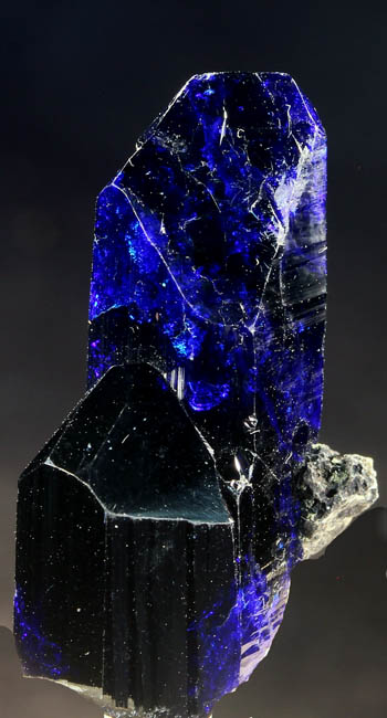 BR616. Azurite. Tsumeb mine, Tsumeb, Namibia. 3cm tall x 1.5 cm 7g $850.00 A gemmy, glassy pair of crystals. Competition quality, superb TN, or small miniature (toenail?). Perfect, brilliant luster translucent crystals. A bit of dust on them I didn't notice. Ex: Claude H. Yoder coll.#1992 Purchased: 2-2007. Ex. Mineralogical Research. I photographed it from all sides. |