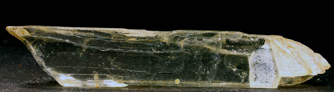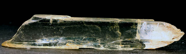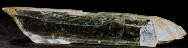 BR618. Spodumene (triphane). Pakistan or Brazil. No label came with this one. A 10.5 cm long crystal. Very pale amber, almost colorless, gem quality. 1 x 2 cm width 49g $295.00 Ex: Wonder Works Minerals |
