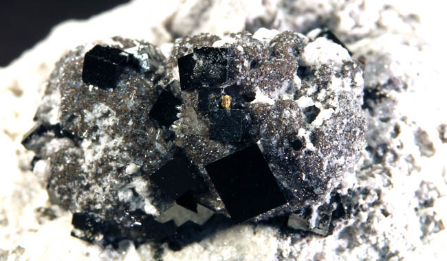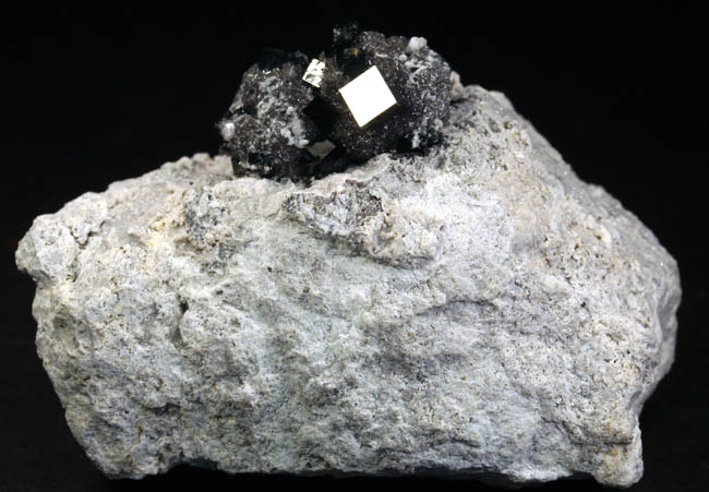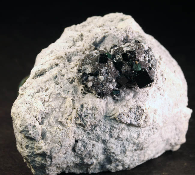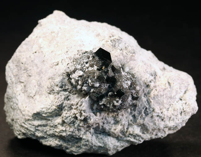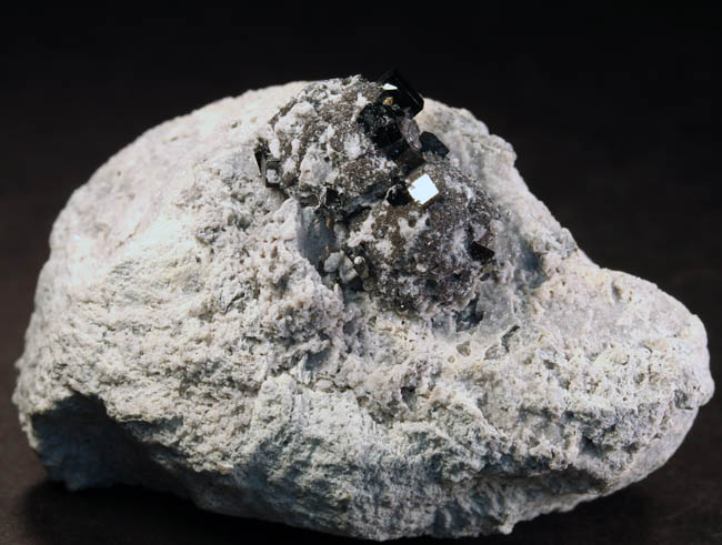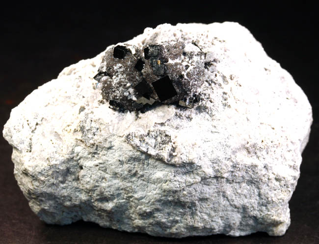 BR614. Cerussite on tennantite. Tsumeb mine, Tsumeb, Namibia. 5 x 4.7 x 2 cm 128g $285.00 Small crystals of cerussite up to 1 cm on black corroded tennantite crystal. Ex: Claude H. Yoder coll. Ex: Mineralogical Research |