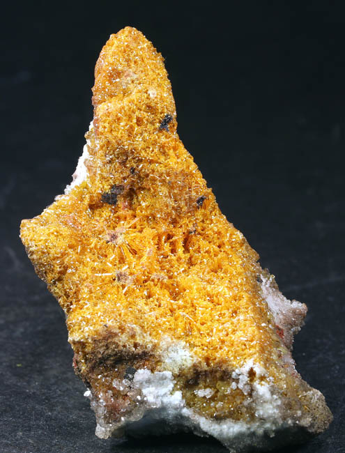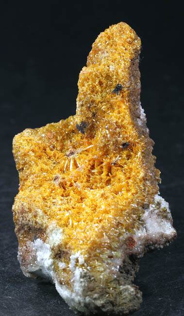 JC13924. Mimetite. Santa Eulalia, Chihuahua, Mexico. 6 x 3 x 2 cm 52g $35.00. Acicular, interlocking, yellow orange crystals on a calcite matrix. Some like this were around about 2010, and quickly vanished from the market. These showed up at Tucson this year in one dealers venue. He only had half a dozen or so of decent quality, and they apparently are from the same area in the mine and recently collected,....he wasn't sure which mine, but thought the San Antonio mine. The last 3 of these I have are offered here. |