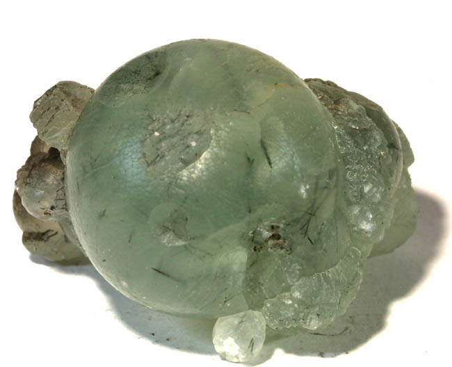 JC12520. Prehnite. Djouga diggings, Bendougou, Diakon, Arrondissement of Diakon, Bafoulabé Cercle, Mali. 3.5 x 4.4 cm 59g $30.00 Light green ball of prehnite with what appears to be either hair like epidote or actinolite inclusions. |