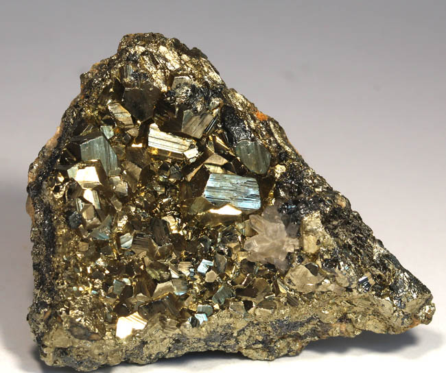JC10477. Pyrite, calcite, sphalerite. Gyongyosoroszi, Matra mountains, Heves county, Hungary. 7.5 x 11 cm 984g. $165.00. A relatively rare location...not often seen are nice specimens from this obscure location. This one has brilliant pyrite crystals partially coated with small, bright calcite crystals and some black sphalerite scattered around. |