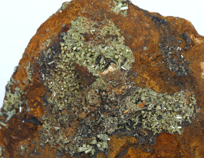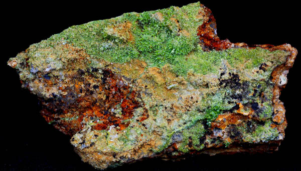 JC10279. Pyromorphite. Wheatley mine, Phoenixville district, Schuylkill township, Chester county, Pennsylvania. 6 x 7.5 cm 126g. $40.00. Typical olive green crystals on oxidized, quartzose matrix. |