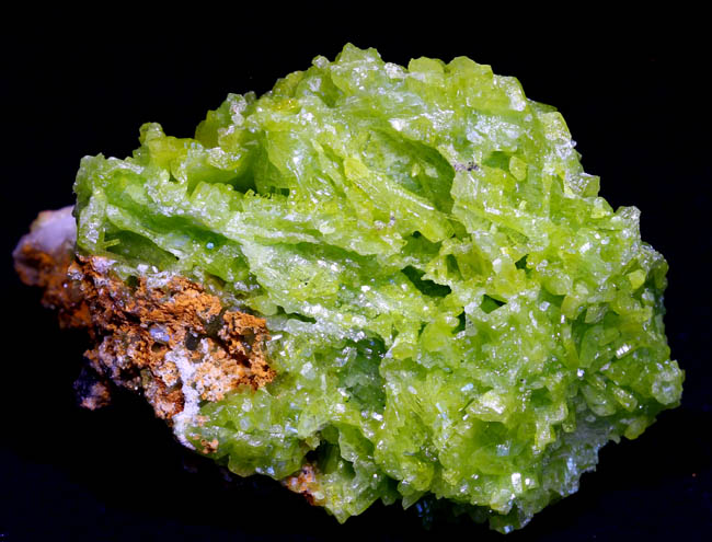 JC11782. Pyromorphite. Daoping mine, Gongcheng county, Guilin, Guangxi, China. 4 x 5 cm 93g. $125.00 Dark green crystals from one area in the mine that produced these. Cluster of lustrous translucent grass-green pyromorphite crystals on brown gossan. The pyromorphite crystals are elongated hexagonal form, with flat basal pinacoid terminations, and are in tapered aggregates of sort of subparallel crystals. This particular style was a limited find, and are pretty much un-available these days. A classic |