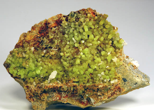 JC9925. Pyromorphite. Barbara vein, Hofsgrund, Schauinsland district, Black Forest, Baden-Wurttemberg, Germany. 4.5 x 7.5 cm 117g. $35.00. Small, bright lime green crystals in vugs and partially coating the matrix. |