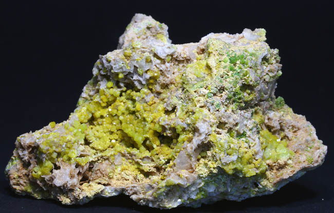 JC12126. Pyromorphite. Daoping mine, Gongcheng county, Guilin, Guangxi, China. 6.5 x 12 cm 269g $125.00. Some larger aggregates of light yellow green pyromorphite, with the rest of the specimen coated with small, acicular, pale yellow crystals. Crystals are slightly lighter in color than the photo would indicate. There is some slight bruising of the globular pyromorphite in the lower right part of the photo. |
