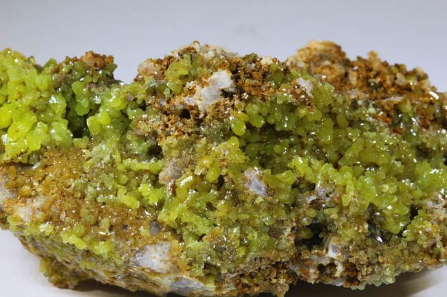 JC11475. Pyromorphite. Les Farges Mine, Ussel, Ussel, Corrèze, Nouvelle-Aquitaine, France. 6.5 x 7 cm 211g. $295.00. Solid coating of mustard color crystals with yellow tips, which are typical from this mine. |