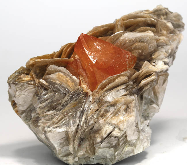 JC9134. Spessartine, quartz, mica. Wushan spessartine mine, Tongbei, Yunxiao county, Zhangzhou prefecture, Fujian prov., China. 7.5 x 8 cm 226g. $98.00. Single quartz crystal protruding from a mound of orange spessartine crystals. One blemish on the right side as seen in this photo. Bright glassy luster on the spessartine. |