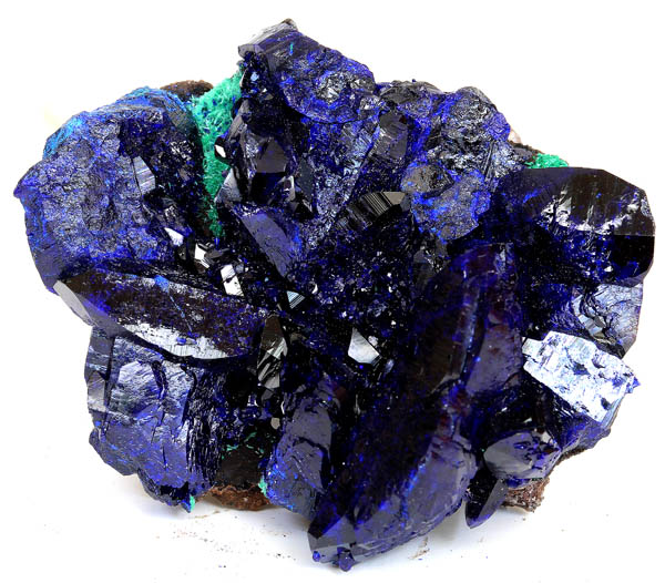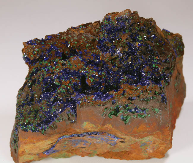JC10694. Azurite, malachite pseudo after azurite. Touissit, Touissit-Bou Beker district, Jerada province, Oriental region, Morocco. 6 x 10 cm 368g. $65.00. Azurite crystals coating the brown matrix. The green areas are azurite crystals replaced by malachite. Colorful, with good luster. |