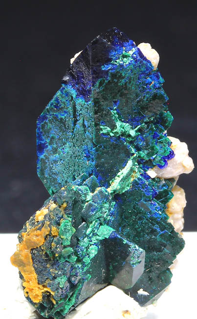 JC10185. Close up view of the larger crystal, which is partially altered to malachite while still having azurite visible. |
