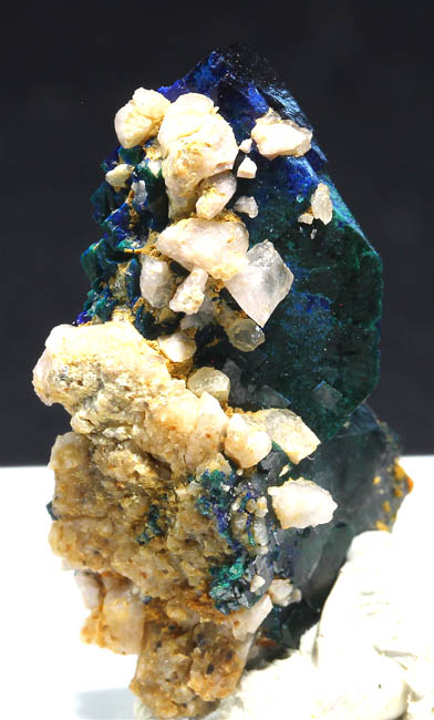 JC12759. Azurite. Vieja mine?, Sierra Rica, Manuel Benavides Municipality, Chihuahua, Mexico. 6.5 x 3 x 4.5 cm 96g. $45.00. Brilliant, dark blue crystals with a bit of associated quartz, and white specks of what appears to be cerussite. Older piece, I traded for quartz crystals at Re-peat Rock Shop, in Auburn, California in December 1970. Piece was collected prior to that, but I don't know by how much. This is the location I was given by the Rock Shop. I could not find a Vieja mine near Sierra Rica on the web. The Vieja mine I did find is in Magistral, Mun. de Ojinaga, Chihuahua, Mexico. There is one reference to the Vieja mine as producing azurite, but no photos or other information. So for now I will stick to Sierra Rica as the location. Crowley collection #61. |