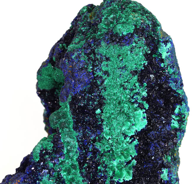 JC11607. Azurite, malachite. Liufengshan mine, Guichi district, Chizhou, Anhui, China. 7 x 8 x 14 cm 866g. $550.00 From the recent finds at the mine. A two sided piece. This side is drusy bladed royal blue crystals with bright luster and a bit of malachite. The other side is azurite with a partial coating of fuzzy, acicular, primary malachite crystals on the azurite. Pretty. |