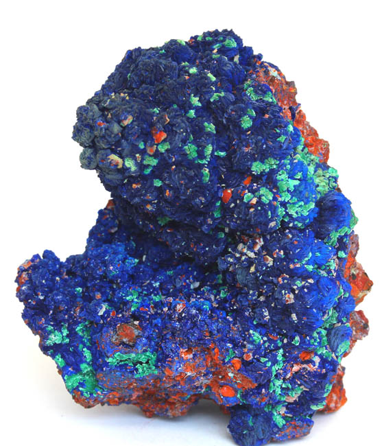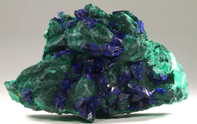 JC11608. Azurite, malachite. Liufengshan mine, Guichi district, Chizhou, Anhui, China. 10 x 16 cm >1000g. $450.00 A large cabinet specimen of the brilliant blue azurite from here. The upper left shows two generations of azurite, the first layer the more brilliant blue, and the next layer on top of this one the more sparkly darker blue. Malachite adds nice contrast. The back side is also of interest, and could also make the display side. It is composed of botryoidal malachite, with a bit of secondary malachite of light green crystals here and there. Along the top edge are azurite crystals implanted on and next to the malachite botryoids for a bit of nice contrast. |