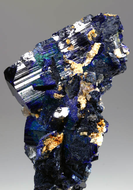 JC10185. Close up view of the larger crystal, which is partially altered to malachite while still having azurite visible. It is on the extreme left side in this photo. |