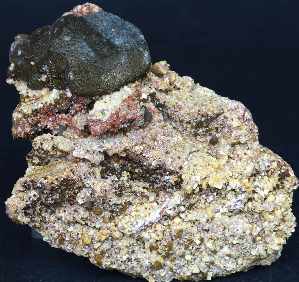 JC11207. Andradite, scheelite. Ridge top prospect, Bishop tungsten district, Coyote ridge, Inyo county, California. 5 x 6 cm 192g. $15.00. The Ridge top prospect is a small prospect on the top of Coyote Ridge, about half way between the northern edge of the tungsten skarn area and the southern edge of the tungsten skarn area, it is on the west center side of Coyote Ridge. The matrix is a lighter color than the Merrill prospect, and is frequently infused with small blebs of scheelite and sometimes as crude crystals with the garnet. In this piece there is a nice subhedral scheelite crystal on the top edge. These were rare in this occurrence. There is another much smaller crystal on the lower left just visible in the photo. ON SALE, TAKE 60% OFF THE MARKED PRICE |