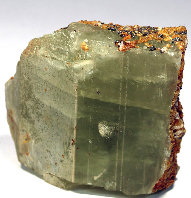 JC12017. Apatite, siderite, pyrite. Panasqueira mines, Covilhă, Castelo Branco, Portugal. 4.5 x 5 cm 86g $40.00. A single crystal partially coated with siderite and little golden crystals of what appears to be pyrite. ON SALE, TAKE 50% OFF THE MARKED PRICE |