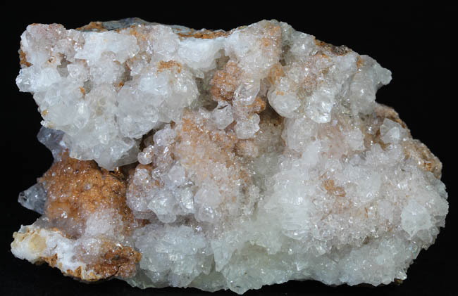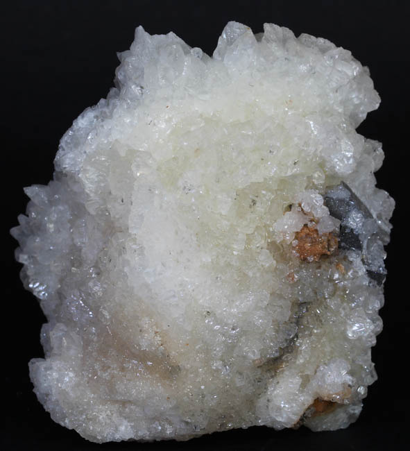 JC12363. Calcite, hemimorphite. Viola mine, Nicholia district, Lemhi county, Idaho. 5 x 9 cm 152g. $10.00. Back in the late 1880's and early 1900's, the Viola mine was one of the largest producers of lead, zinc, and silver in Idaho. It had a thriving town, now gone. The low grade ore consisted almost entirely of hemimorphite and some smithsonite. This is an example of the low grade zinc ore, with micro crystalline hemimorphite crystals partially covered by somewhat blebby calcite crystals. Good example for a locality piece. ON SALE, TAKE 40% OFF THE MARKED PRICE. |