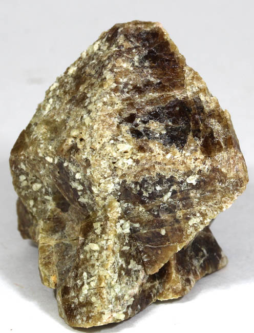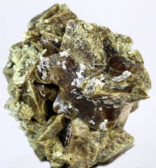JC10983. Vesuvianite. Nr. Clio, Plumas county, California. 3.5 x 4.5 x 6.5 cm 77g. $40.00 Main crystal is 3.5 cm. It is mostly complete. Not visible in this view, the lower right tip of the face is broken off. Visible in the 3rd photo below. In this view the brown crystals have glassy luster and are complete. The light patches are where diopside used to reside and is now mostly gone.` ON SALE, TAKE 60% OFF THE MARKED PRICE. |