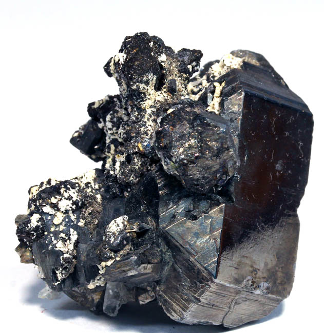 JC12079. Bournonite? Yaogangxian Mine, Yaogangxian W-Sn ore field, Yizhang Co., Chenzhou, Hunan, China. 5 x 7.5 cm 520g $250.00 All the label said on this one is Yaogangxian mine. Could possibly be ferberite of unusual form. Non magnetic, insoluble in HCl...so I tend to think bournonite. Flat topped, squatty crystals. |