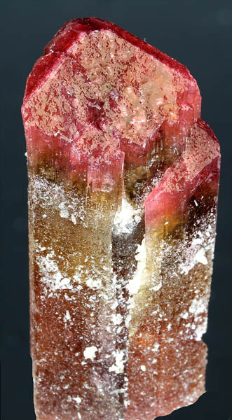 JC10490. Elbaite/Rubellite. Malkhan Pegmatite Field, Krasnyi Chikoy, Chitinskaya Oblast, Transbaikal, Eastern Siberia, Russia. 5 cm tall crystal. 39g. $290.00 Pinkish red termination, with the sides partially coated with microscopic quartz crystals which add sparkle to the sides. Discovered in 1980 by Russian geologists, this area has been a prolific source of beautiful (and expensive) tourmaline specimens. |