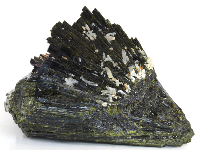 JC13523. Epidote, quartz, axinite. Cullhuay, Huaros District, Canta Province, Lima, Peru. 8 x 5 x 2.5 cm 115g $75.00 Upright blades of epidote with some scattered blades of brown axinite here and there. |