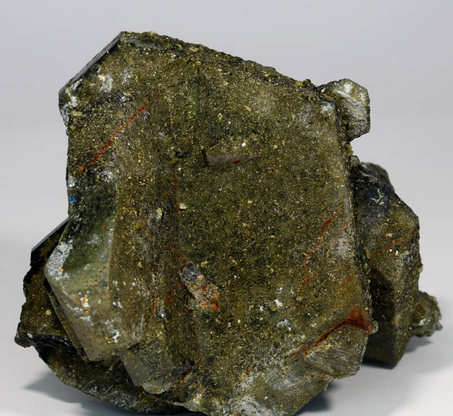 JC12696. Epidote, hematite. Pakot, North Eastern Province, Kenya. 6 x 4.5 x 3 cm 118g $10.00. Several mostly flat lying epidote crystals, covered with micro crystalline sparkly hematite. From the find of about 20 years ago. |