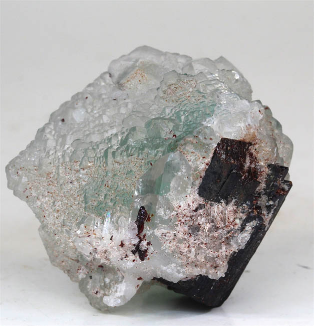 JC11596. Fluorite, hubnerite. Pasto Bueno, Pampas district, Pallasca province, Ancash department, Peru. 3.5 x 4 cm 52g. $30.00. Modified octahedron, sort of light green color, with hubnerite crystal on the back. |