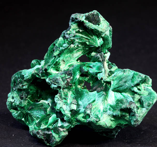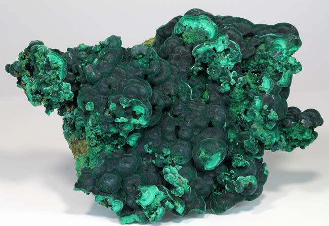 JC11610. Malachite. Shilu mine, Yangchun county, Yangjiang, Guangdong, China. 6 x 13 cm 509g. $200.00. From the recent finds at the Shilu mine, sharp botryoids of malachite making up a solid mass of malachite. |