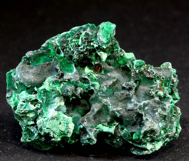 JC10474. Malachite. Mindingi mine?, Shaba, Democratic Republic of Congo (Zaire). 9.5 x 10 cm 782g. $150.00. The botryoidal malachite in this piece has intense green color, with what appears to be a thin, secondary coat of bright sparkly malachite crystals. The piece has lots of sparkle and great eye appeal. |