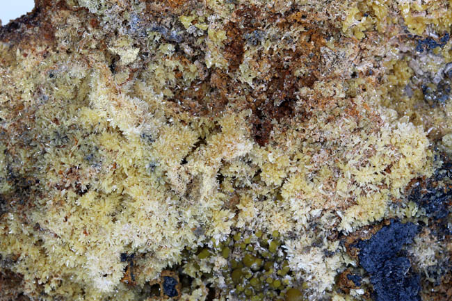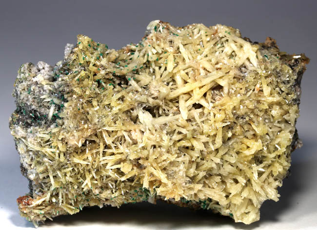 JC12796. Mimetite. Tsumeb mine, Tsumeb, Namibia. 10 x 6 x 2.5 338g $90.00. Pale yellow acicular crystals. |