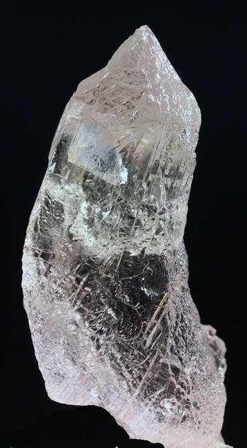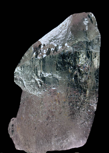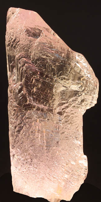 BR106. Kunzite (Spodumene) Urucum m., Corrego do Urucum Pegmatite, Galileia, Rio Doce, Brazil. 8 x 3 x 2.5 cm 127g $250.00 Facet quality, clear, etched crystal with bright luster. Very pale pink on long axis. Camera picked up a bit of pink in this side exposure, more so than in reality. Ex: Arnold S. Goldstein coll. #433 . Ex Argentum Auctioneers #433, . Ex: Earth’s Treasures 3-2009. |