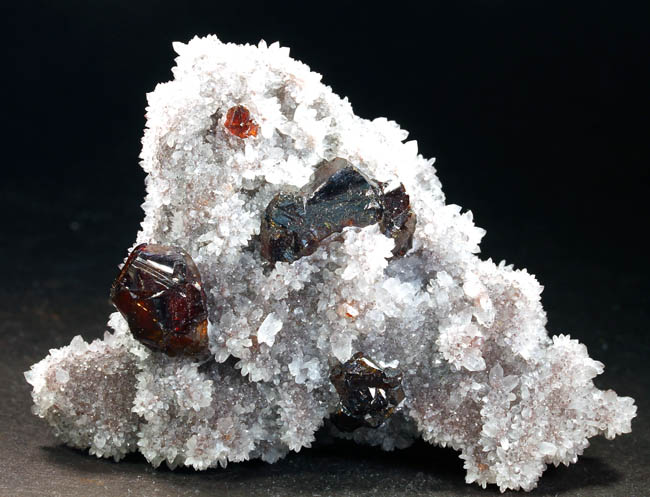 BR221. Sphalerite, quartz. Shuikoushan Mine, Shuikoushan ore field, Changning Co., Hengyang, Hunan, China. 7 x 6 x 2 cm 109g $375.00 Three crystals, largest 2 cm on drusy quartz. Fairly gemmy, and quite translucent. The sphalerites are a bit lighter in color. Reddish orange gemmy Sphalerite crystals with typical complex twinning are well exposed on contrasting matrix. Excellent luster, the Sphalerites with backlighting glow a bright reddish orange/amber, they can seem very dark without it. From the vintage finds at Shuikoushan; in excellent condition with no visible damage. The matrix is druzy quartz. Very esthetic, these were once found in large quantities but few were this choice, they are no longer coming out from this locality. When I tried to lighten up the photos to show the true color on the sphalerites, the quartz got so white that it lost crystal definition on the photos. Ex: Roberts Minerals Purchased: 4-1999 |