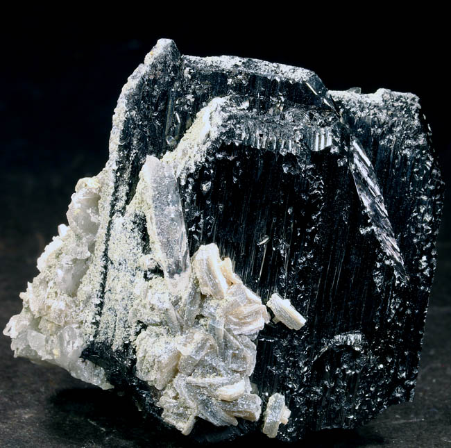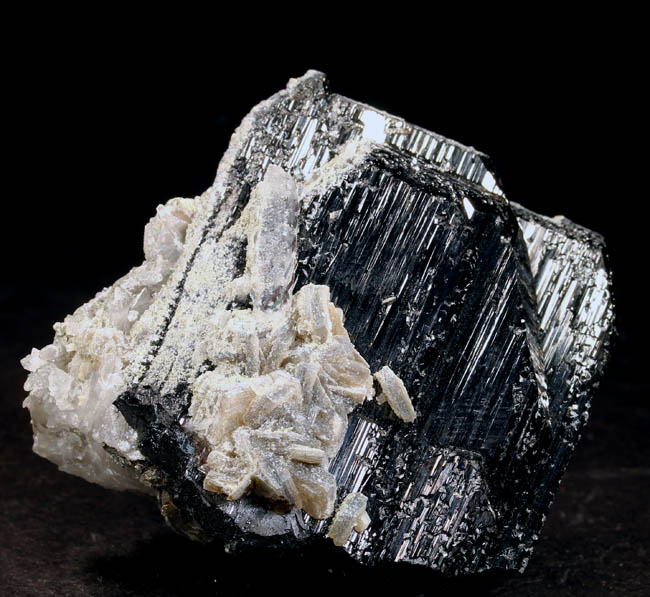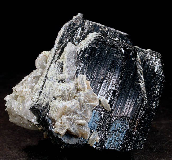BR222. Wolframite (Ferberite). Xi Kuang Shan, Hunan province., China on the label. No such location as this; although it is on the label. Probably Yaogangxian Mine, Yaogangxian W-Sn ore field, Yizhang Co., Chenzhou, Hunan, China. 5 x 5 x 2.5 cm 124g $135.00 Sharp, perfect and isolated Wolframite var. Ferberite with Quartz crystals covering its back. Its fine metallic luster really highlights the silvery-black color of this piece with complex well-formed terminations, outstanding. Ex: Mineralogical Research . |