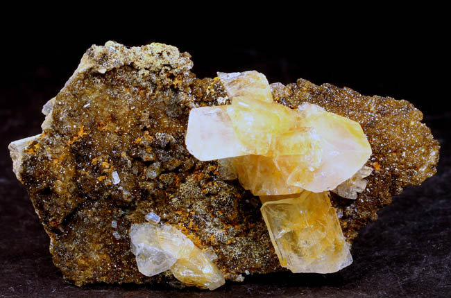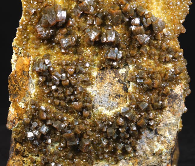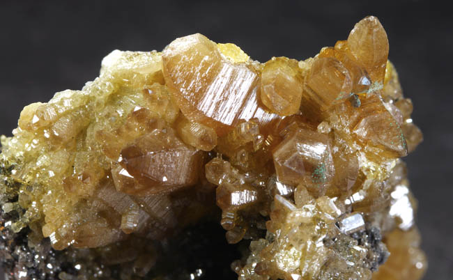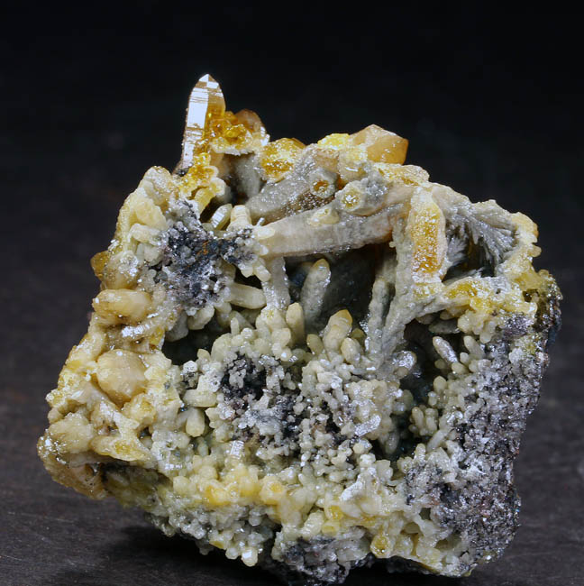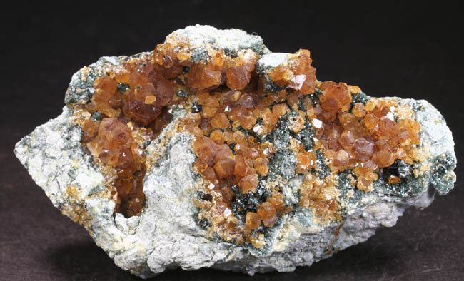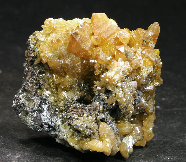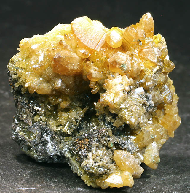 BR264. Topazolite var. andradite, clinachlore. Yellow Cat mine, Serpentine dome, New Idria district, San Benito county, California. 8 x 4 x 2 cm 95g $400.00 Golden crystals to about 6mm across, with nice bright luster. Ex: Steve Perry Minerals Purchased: 8-2007. Much better than most from here. Specimens of this quality have not come out from here in several years. RESERVED |