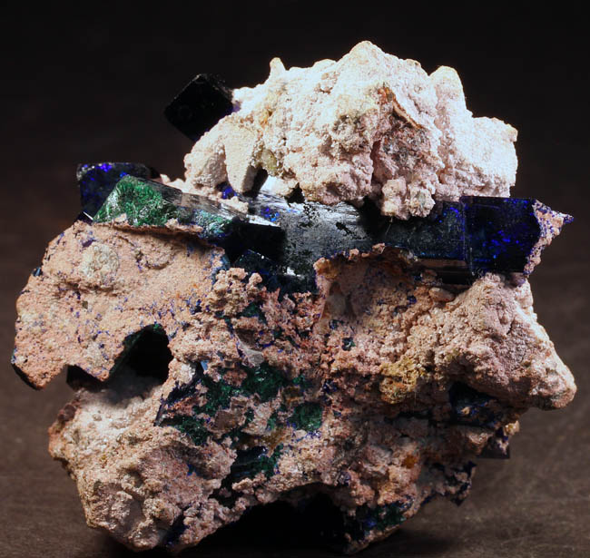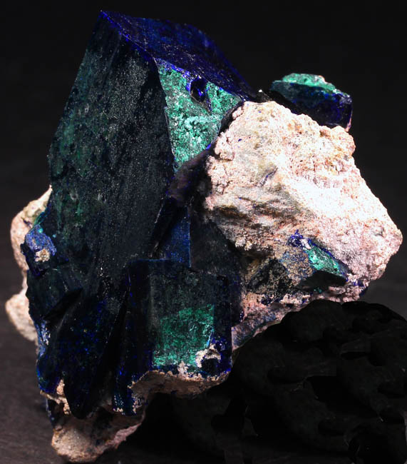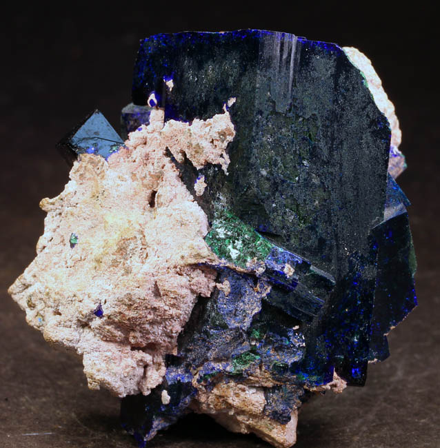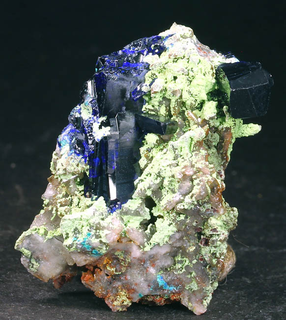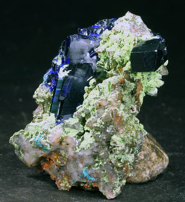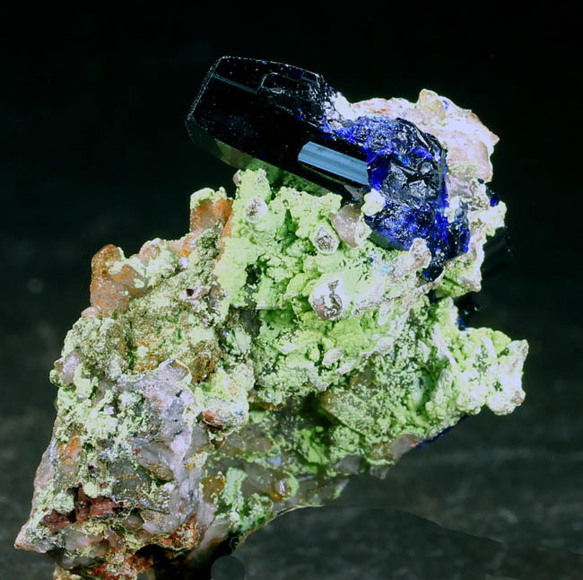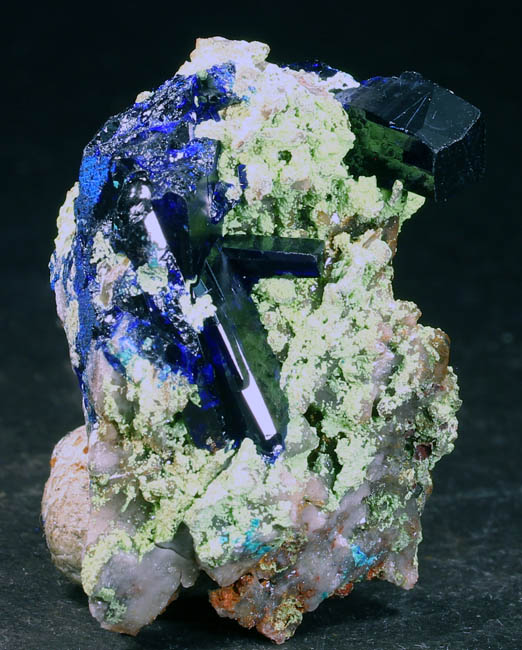 BR619. Azurite, duftite, quartz. Tsumeb mine, Tsumeb, Namibia. 3 x 4 cm 21g $325.00 Two azurite crystals, blocky, 1.5 cm and 2 cm on quartz, with duftite on matrix. Ex: Claude H. Yoder coll.#1837 Purchased: 4-2006 Ex: Mineralogical Research. |