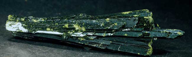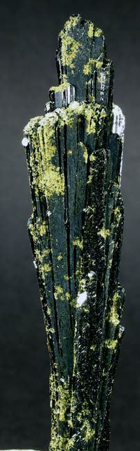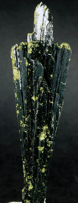 BR466. Epidote, quartz. Capelinha, Jequitinhunha valley, Minas Gerais, Brazil. 9.5 cm long x 2.8 cm wide. 37g. $90.00 Ex: Crystal Mine JC6041 . Ex: Jim McEwen coll.#2403 Purchased: 6-2011. The lighter green with a yellowish tint that is spotted around on the crystal is much more subdued in reality. Dark green lustrous crystal group. |