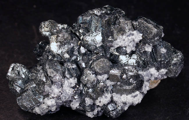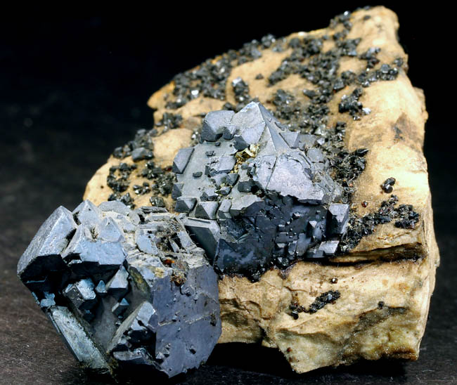 BR621. Galena, sphalerite. Mid Continent mine, Treece, Cherokee County, Kansas. 6.5 x 5 x 1.5 cm 117g $150.00 Two 2 cm cubes of dull luster galena, on chert with mm size rather dull sphalerites. Ex: Uncarved Block Minerals. |