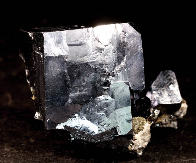 BR625. Galena, pyrite. Sweetwater mine, nr. Ellington, Viburnum Trend district, Missouri. 3.5 x 2.7 216g $98.00 Ex: Claude H. Yoder coll. Ex: Mineralogical Research. Sharp slightly modified cubes, with a bit of pyrite and dolomite attached at the base. |