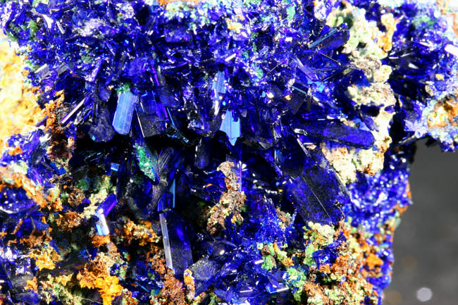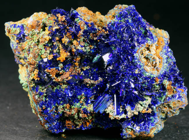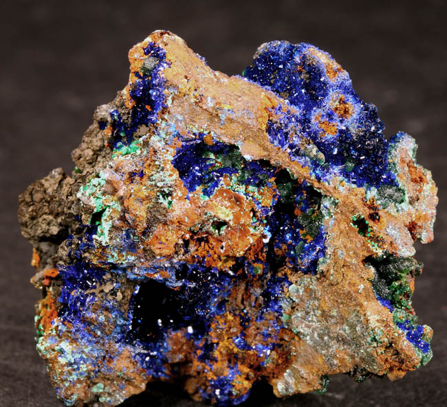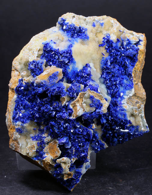 JC13469. Azurite. El Cobre mine, Concepción del Oro, Concepción del Oro Municipality, Zacatecas, Mexico. 5 x 4 x 2.5 cm 110g $110.00 Sparkling translucent blue crystals of azurite scattered throughout the front of this goethite matrix. Classic material for this old locality. These were collected back in the 1960's. Brilliant blue, gemmy crystals scattered around in small vug like openings. From an old collection. |