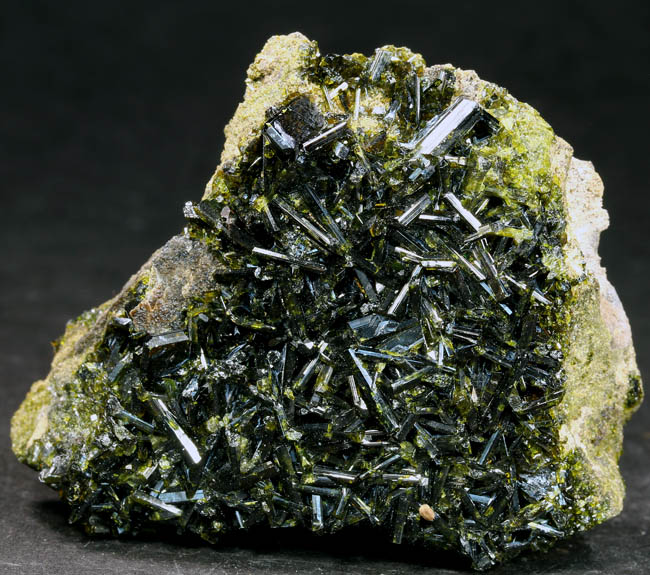 JC10031. Epidote. Khorwin Mt., Kuhandan, Saveh Town, Tafresh City, Markazi Prov., Iran 4.5 x 5 cm 92g. $35.00. Flat face of matrix is covered with prismatic green epidote crystals from a find reportedly made in /about/ 2002. Apparently a single pocket find, now exhausted, according to 2006 information on Mindat. |