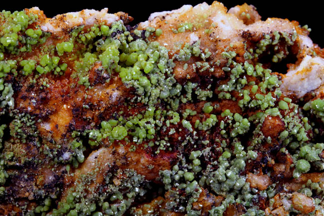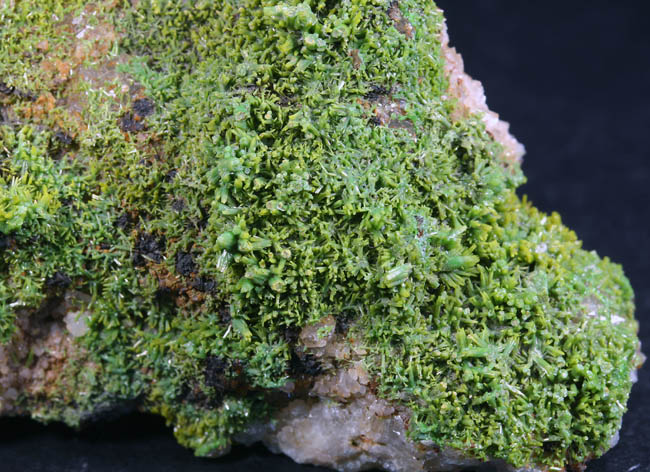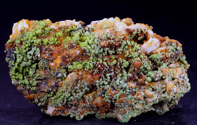 JC9924. Pyromorphite. Barbara vein, Hofsgrund, Schauinsland district, Black Forest, Baden-Wurttemberg, Germany. 5 x 9.5 cm 169g. $35.00. Bright green, small crystals encrusting the matrix. This was once an important silver mine with lead also. Long closed, mostly reclaimed land. Mineral specimens attributable to this historic old mine are rare. Tiny, gemmy, rich green, textbook hexagonal pyromorphite prisms are richly invested in the vuggy front of the sculptural gossan matrix. The prisms reach about 4 mm, but most are smaller. Rich silver mining started in the area in 1372, where the Lord of Freiburg declared the first mining law in all of the southern German mining fields (MINDAT)! Ex Kay Robertson Collection # 2630 and acquired in Germany in September,1962. RESERVED |