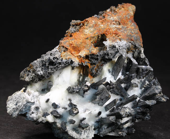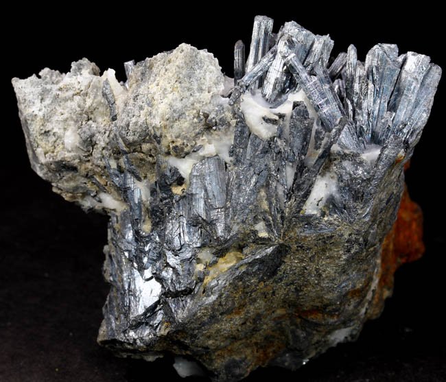 JC10153. Stibnite. White Caps mine, Manhattan district, Nye county, Nevada. 5 x 6.5 cm 168g. $20.00. A group of crystals that were covered with calcite. When I etched the calcite away, the crystals are exposed as seen. Most of them sticking above the calcite that was there are broken off. A couple of the smaller crystals that were buried in the calcite are terminated. Interesting as a locality piece. |