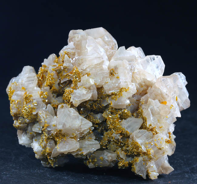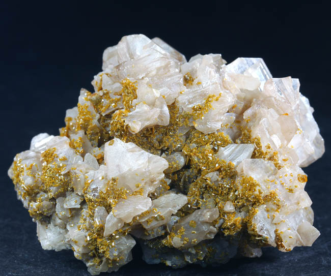 JC10193. Cerussite, wulfenite. Nakhlak mine, Anarak district, Nain county, Isfahan province, Iran. 4 x 5.5 cm 70g. $145.00. A reticulated group typical from this location, although a bit unusual as it has druses of small yellow wulfenites scattered and partially covering some of the cerussite. Collected in 2001. Supposedly the locality is collected out now |