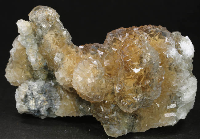 JC10124. Mimetite. Tsumeb mine, Tsumeb, Namibia. 8.5 x 4 x 2 cm $150.00. Fat, lustrous, light yellow crystals. A bit of contact on the far right...probably where the piece was up against the pocket wall. Largest crystals are near 1 cm in size. RESERVED |