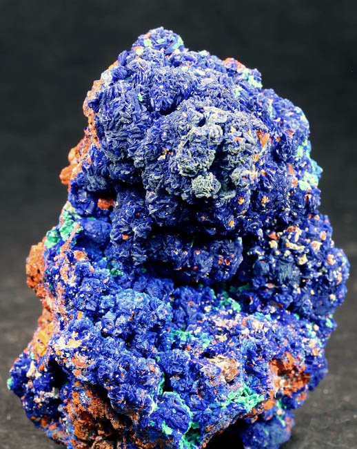 BR505. Azurite. Burra Burra mine, North Mount Lofty Ranges, South Australia, Australia. 7 x 6 x 4.5 cm 265g $250.00 Bright blue globular ball of micro crystalline azurite...solid azurite. Specimens of azurite were discovered in a clay zone in the early 70s when this old mine was open cut. Ex: CK Minerals. Ex Mineralogical Research; purchased April 2013 I photographed it from all sides. |