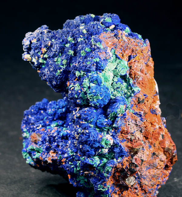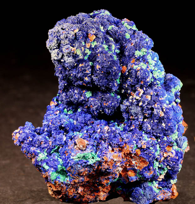 JC13246. Azurite, malachite. M'Ssici, Alnif Cercle, Tinghir Province, Drâa-Tafilalet Region, Morocco. 6 x 4.5 x 5 cm 128g $65.00 A typical piece from here, these came out a number of years ago. Blue, sort of botryoidal azurite rosettes with scattered malachite alteration. No more of this quality have been coming out for several years. This piece was collected about 2010 . |