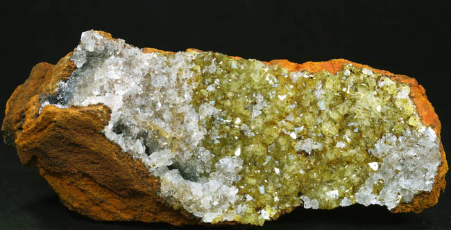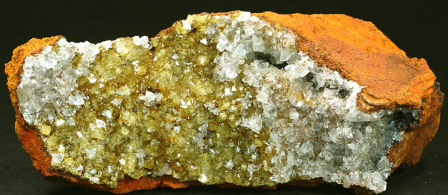 JC13252. Adamite. Ojuela mine, Mapimi, Durango, Mexico. 16 x 4.5 x 3.8 cm 160g $85.00 Very bright and sparkly golden color adamite, with a partial coating of calcite on one end. |