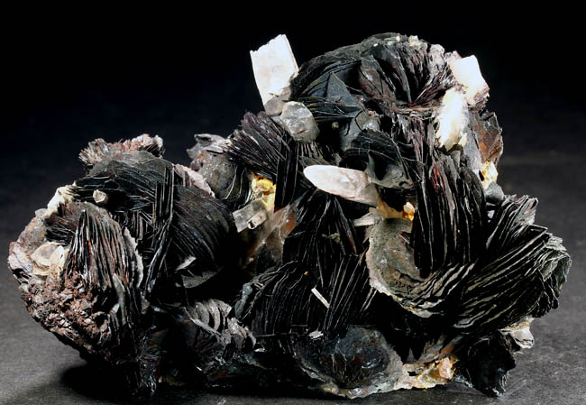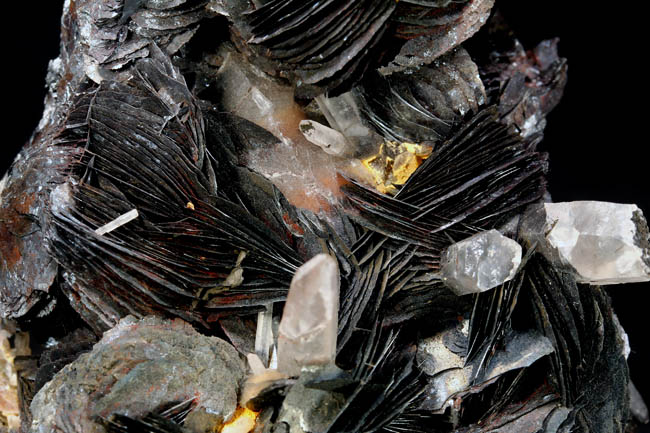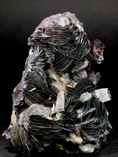 JC13796. Hematite, quartz. Jinlong Hill, Longchuan Co, Heyuan, Guangdong, China. 7.5 x 7.5 cm tall x 5.5 cm front to back. 243g $50.00. Quartz crystals make a nice back drop to the hematite blades in the foreground. |