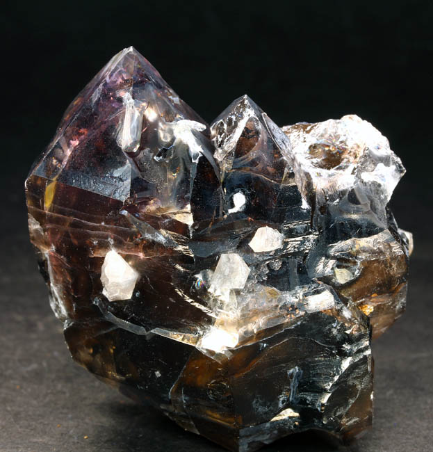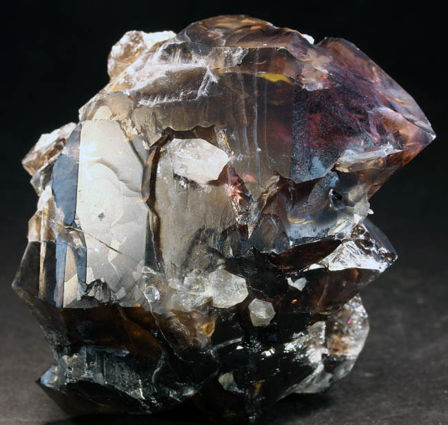JC8123. Quartz (Smoky and amethystine) Petersen Mountain, Hallelujah Junction area, Washoe County, Nevada . 6 x 7 cm Tall. 155g $30.00. I collected this in 2012...it is one of those that used to be perched on the end of a quartz crystal as a scepter, but has come loose and is now a partially doubly terminated smoky crystal with about half amethystine as can be seen in the photos. Has a decent glassy luster. RESERVED |
